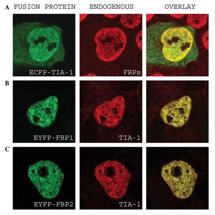 transfected with pECFP-TIA-1 (A), pEYFP-FBP1 (B), and pEYFP-FBP2 (C) constructs. Twenty-four hours after transfection, the cells were fixed,