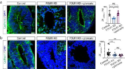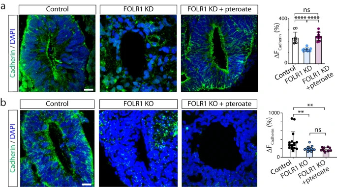 Fig. 3: FOLR1 enables cadherin enrichment in apicolateral neural cells surrounding the lumen of neural tube-like structures in hiPSC-derived neural organoids by a non-metabolic mechanism. a hiPSC-derived embryoid bodies were incubated with 2M control-vivo-morpholino (Control), FOLR1-vivo morpholino (FOLR1 knockdown (KD), FOLR1-MO) or FOLR1-MO and 50M pteroate (FOLR1 KD + pteroate) until 1821 days in vitro when neural organoids were fixed and processed for immunostaining and nuclear labeling with DAPI. b Cultured hiPSCs reaching 75% confluency were transfected with FOLR1-sgRNA/CRISPR/Cas9 (FOLR1 KO) and used for neural organoid cultures. Cultures were supplemented with vehicle (Control) or 50M pteroate (FOLR1 KO + pteroate) until 1821 days in vitro when neural organoids were fixed and processed for immunostaining and nuclear labeling with DAPI. a, b Images are examples of immunostained neural tube-like structures. Graphs show individual and meanSD maximum percent change in cadherin immunolabeling fluorescence intensity when crossing the lumen per neural tube-like structure, n=9 (a) and n=12 (b) neural organoids per group, N=3 independent experiments. **p<0.01, ****p<0.0001, ns not significant, one-way ANOVA, Tukey post-hoc multiple comparison test. Scale bars are 20m. Source data are provided as a Source Data file. |