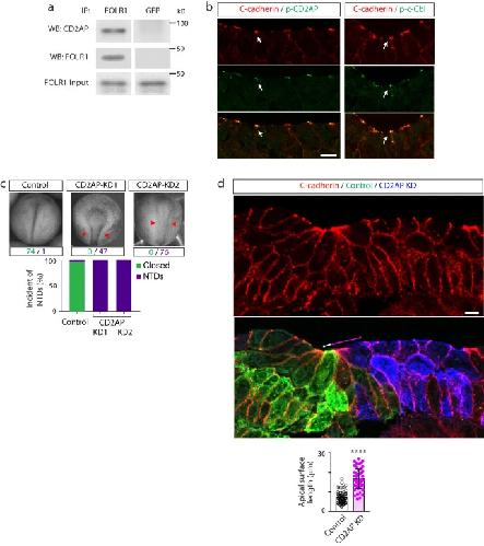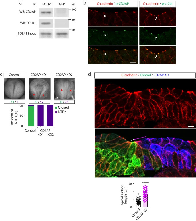 Fig. 6: CD2AP interacts with FOLR1 and is necessary for apical constriction and neural tube formation. a Neural plate stage Xenopus laevis embryos were processed for co-immunoprecipitation (IP) assays. Example of Western blot assay from immunoprecipitates with FOLR1 or GFP (control) antibodies and probed for CD2AP or FOLR1. Similar results were observed in N=3 independent experiments. b Neural plate stage Xenopus laevis embryos were fixed and processed for immunostaining. Images are transverse single z-sections of immunostained neural plate showing apical colocalization of phospho-CD2AP (p-CD2AP) and p-c-Cbl with C-cadherin. Scale bar, 10m. Similar results were observed in N=3 independent experiments. c Two-cell stage Xenopus laevis embryos were bilaterally microinjected with 9.9pmol of Control-morpholino (Control, Control-MO), 2.6pmol CD2AP-MO1 (CD2AP KD1) or 7.49.9pmol CD2AP-MO2 (CD2AP KD2/KD) per blastomere until neural tube closed in control embryos, when they were fixed and photomicrographed. Examples of whole embryos in each group. Arrowheads indicate open neural tube (neural tube defect, NTD). Numbers are embryos presenting closed (green) or open (purple, NTD) neural tube. Bar graph represents proportion of phenotypes in each group. d Two-cell stage Xenopus laevis embryos were unilaterally microinjected with 9.9pmol Control-MO (Control) and 7.49.9pmol CD2AP-MO2 (CD2AP KD) along with GFP and mCherry mRNA, respectively, and allowed to develop until they reached mid-neural plate stages, when they were fixed and processed for immunostaining. Image is a transverse section of the neural plate, immunostained for GFP (Control), mCherry (CD2AP KD) and C-cadherin. Double arrows indicate apical surface length of medial superficial Control (white) and CD2AP KD (magenta) neural plate cells. Scale bar, 20m. Graph shows individual and meanSD apical length of superficial neural plate cells per embryo, n of cells=75 in each half of the neural plate, N of embryos=4. ****p<0.0001, two-tailed paired t-test. Source data are provided as a Source Data file. |