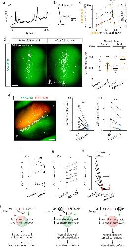 Fig. 9: Folate-FOLR1 contribute to Ca2+ dynamics in neural plate cells during neural plate folding. ac Neural plate from mid neural plate stage Xenopus laevis embryos was dissected and dissociated cells plated in vitro. After 2h, cells were loaded with the Ca2+ sensor Fluo4-AM and time-lapse imaged. a Example of 1-h recording of neural plate cell Ca2+ activity. b, c Folinic acid (b, c), folic acid (c) or vehicle was added to neural plate cells in culture during time-lapse imaging and the Ca2+ response was recorded in the first minute post addition. b Example of acute transient elicited by 100M folinic acid. c Graph shows meanSEM folinic- or folic acid-responsive neural plate cells compared to total number of cells with spontaneous Ca2+ transients in 30min recording, N=3 independent experiments. Two-tailed one sample t and Wilcoxon test. d Two-cell stage embryos were bilaterally microinjected with GCaMP6s mRNA and grown until early and mid-neural plate stages when they were time-lapse imaged before and after addition of vehicle or 300M folinic acid. Image shows example of embryo with cells exhibiting Ca2+ transients indicated with circles. Graph shows individual and meanSD percent change in Ca2+ transient frequency before and after addition of vehicle or folinic acid, n=4, 5, 6 and 7 embryos for Early-Vehicle, Early-Folinic acid, Mid-Vehicle and Mid-Folinic acid groups, respectively. One-sample two-tailed t-test, compared to hypothetical value of 100%. eh Two-cell stage embryos were bilaterally microinjected with GCaMP6s mRNA (eh) and unilaterally microinjected with 9.9pmol FOLR1-MO1 (FOLR1 KD1/KD) or 1.6pmol FOLR1-MO2 (FOLR1 KD2) per blastomere (e) and grown until mid-neural plate stages when they were time-lapse imaged. Image in (e) shows example of embryo with cells exhibiting Ca2+ transients indicated with circles in WT and FOLR1 KD1 halves. Graphs show individual Ca2+ transient frequency (transients/5min) in WT and FOLR1 KD1 or KD2 halves (e, n=6 embryos) and in WT embryos before and after addition of vehicle (f, n=7 embryos), 50M folic acid (g, n=6 embryos), Na+ and voltage-gated Ca2+ channel blockers (VGCblock: 0.02% tricaine+10M nitrendipine+25M TTA-2, h, n=5 embryos), or a mix of folic acid and VGCblock (h, n=5 embryos). Two-tailed paired t-test (eg) and 1-way ANOVA-Tukey multiple comparisons test (h). In (ch), *p<0.05, **p<0.01, ***p<0.001, ****p<0.0001, ns: not significant. i Model of FOLR1 and CD2AP regulation of neural tube formation. Source data are provided as a Source Data file. |