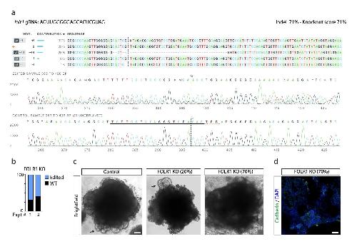 Supplementary Fig. 2. High score FOLR1 knockout hiPSCs impede development of neural organoids. Approximately 60% confluent hiPSCs seeded in 6-well plates were incubated with 1.2 µg FOLR1- targeted synthetic gRNA, 6.25 µg Cas9 and lipofectamine CRISPR transfection reagent for 48 h. After sequential dilutions, cells were then seeded on multiwells and allowed to form colonies, which were screened for transformation. Samples were then processed for sequencing, ICE knockout (KO) analysis (a,b) and morphological assessment (c,d). a, Experimental assessment of CRISPR/Cas9-mediated FOLR1 gene deletion by ICE KO analysis. The Cas9 cleavage site is indicated in vertical dashed line. Wild-type sequence is marked by + (left, 0). Sanger sequencing chromatograms show edited and control sequences around the region of the guide sequence as underlined with horizontal black line. PAM site is underlined with dotted red line. b, Graph shows the proportion of FOLR1 edited cells in transfected hiPSCs in 2 experiments, exhibiting 60-70% FOLR1 KO. c-d, Examples of brightfield (c) and immunostained (d) images of control (wild-type, c) 20% (c) and 70% FOLR1 KO hiPSC-derived neural organoids (c,d). Arrows in c indicate morphologically distinguishable neural tube-like structures. Scale bars, 100 µm. |