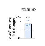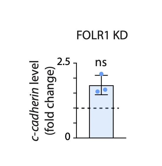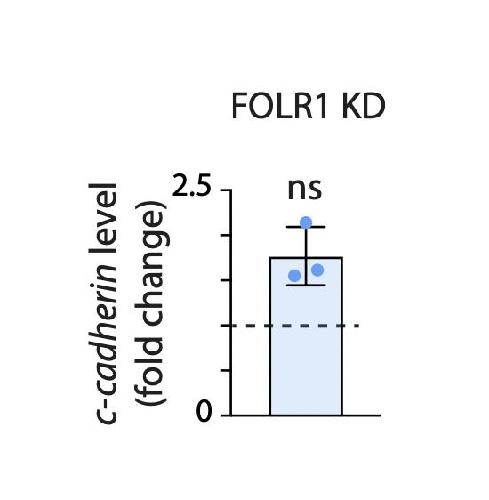 Supplementary Fig. 4. FOLR1 knockdown in Xenopus laevis embryos does not affect ccadherin transcription. Two-cell stage embryos were injected with 3.2 pmol Control-morpholino (Control) or FOLR1- splicing-blocking morpholino (FOLR1 KD) per blastomere. Neural plates from injected stage-16 Xenopus laevis embryos were dissected and processed for mRNA extraction followed by in vitro conversion into cDNA. Samples were subjected to quantitative PCR assays with ODC as normalizing transcript. Graph shows individual and mean±SD fold change in c-cadherin transcript level compared to Control samples (1, dashed line), ns: not significant, two-tailed ratio t-test, n=27 neural plates per group, N=3 independent experiments |