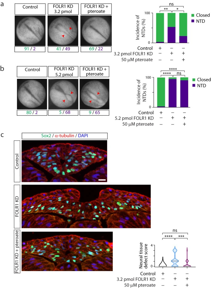 Fig. 2: FOLR1 is necessary for neural tube formation in Xenopus laevis embryos through a non-metabolic mechanism. Two-cell stage Xenopus laevis embryos were microinjected with 3.2 (a, c) or 5.2 (b) pmol Control-MO (Control) or FOLR1-MO (FOLR1 KD) per embryo and incubated with saline or 50M pteroate until the neural tube closed in control embryos, when they were fixed, photomicrographed (a, b), sectioned and processed for immunostaining (c). a, b Examples of embryos in each group. Arrowheads indicate open neural tube (neural tube defect, NTD). Numbers are embryos presenting open (NTD, purple) or closed (green) neural tube. Bar graphs represent proportion of phenotypes in each group. c Examples of immunostained transverse sections of the neural tissue; n of embryos sectioned was 25, 39 and 42 in Control, FOLR1 KD, and FOLR1 KD+pteroate groups, respectively, in N=3 independent experiments. Scale bar is 20m. Graph shows distribution of neural tissue defect score per group, median is indicated by dashed line. In (ac), *p<0.05, **p<0.01, ***p<0.001, ****p<0.0001, one-way ANOVA, Tukey post-hoc multiple comparison test (a, b), or Kruskal-Wallis, Dunns multiple comparison test (c). Source data are provided as a Source Data file. |