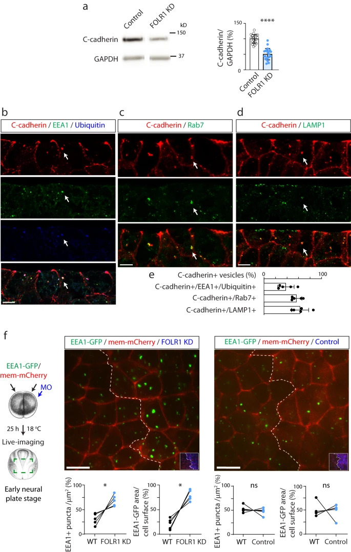 Fig. 4: FOLR1 regulates C-cadherin protein level and endocytosis from apical neural plate cell membrane. a Two-cell stage Xenopus laevis embryos were bilaterally microinjected with 1.6pmol Control-MO (Control) or FOLR1-MO (FOLR1 KD) per blastomere and allowed to grow until they reached mid-neural plate stages (stage 1517) when neural plate was dissected and processed for Western blot assays. Example of Western blot assay. Graph shows individual and meanSD percent of optical density (OD) for C-cadherin immunoblot band normalized with GAPDH protein band OD and compared to controls. Two-tailed ratio t-test, n=42 and 44 neural plates for Control and FOLR1 KD groups, respectively, N=8 independent experiments. be Neural plate stage Xenopus laevis embryos were fixed, sectioned and processed for immunostaining. bd Examples of immunostained neural plate. Arrows indicate colocalization of C-cadherin with early endosomal marker (EEA1) and ubiquitin (b), late endosomal marker (Rab7, c) and lysosomal marker (LAMP1, d). Scale bar, 10m. e Graph shows meanSD proportion of C-cadherin vesicles colocalizing with the indicated markers. Number of cells analyzed were 104, 52, 65 from immunostained samples in (b, c and d), respectively, from N=5 embryos. f Two-cell stage Xenopus laevis embryos were bilaterally microinjected with hEEA1-GFP mRNA and membrane mCherry and unilaterally microinjected with 2.63.2pmol FOLR1-MO (FOLR1 KD) or Control-MO (Control) per blastomere along with fluorescent tracer and allowed to develop until they reached early neural plate stages (stage 13-14), when they were time-lapse imaged with an acquisition rate of 1 frame/6min. Schematic shows experimental design. Xenopus illustrations Natalya Zahn (2022) obtained from Xenbase (www.xenbase.org RRID:SCR_003280), released under a Creative Commons Attribution-NonCommercial 4.0 License (CC BY-NC)68. Images are maximum intensity projection of single time frame. Dashed lines indicate border between wild-type (WT) and MO-injected neural plate. Insets show neural plate injected side with tracer in blue. Graphs show distribution between both halves of the neural plate (in %) of the number of EEA1-GFP vesicles and area fraction of labeled endosomes per neural plate cell surface. Two-tailed paired t-test; ns: not significant, n=30 cells analyzed in each group, N=5 embryos per group. Scale bar, 20m. In a, f, *p<0.05, ****p<0.0001. Source data are provided as a Source Data file. |
