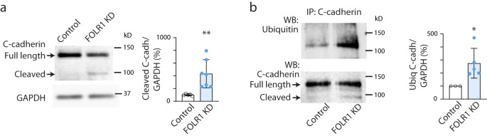 Fig. 5: FOLR1 downregulation enhances C-cadherin cleavage and ubiquitination in Xenopus laevis neural plate. Two-cell stage Xenopus laevis embryos were bilaterally microinjected with 1.6pmol Control-MO (Control) or FOLR1-MO (FOLR1 KD) per blastomere, incubated from early neural plate stage (stage 12) with vehicle or proteasome and lysosome inhibitors until they reached mid-neural plate stages (stage 1617) when neural plates were dissected and processed for Western blot (a, b) and immunoprecipitation (b) assays. a Example of Western blot assay immunoprobed for C-cadherin showing full-length and cleaved (~80kD) forms. Graph shows individual and meanSD percent of optical density (OD) for cleaved C-cadherin band normalized with GAPDH protein band OD and compared to controls, n=20 and 26 neural plates for Control and FOLR1 KD groups respectively, N=3 independent experiments. b Example of immunoprecipitation (IP) assay for C-cadherin followed by Western blot assay for ubiquitin and C-cadherin. Graph shows individual and meanSD percent of optical density (OD) for ubiquitinated (Ubiq) C-cadherin band normalized with full-length C-cadherin and compared to controls. In (a, b), *p<0.05, **p<0.01, two-tailed ratio t-test, n=16 and 24 neural plates for Control and FOLR1 KD groups respectively, N=3 independent experiments. Source data are provided as a Source Data file. |