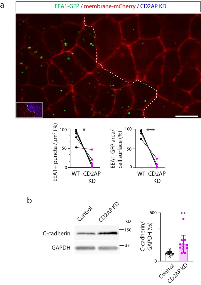 Fig. 7: CD2AP is necessary for apical endocytosis and C-cadherin turnover in the neural plate. a Two-cell stage Xenopus laevis embryos were bilaterally microinjected with hEEA1-GFP and membrane mCherry mRNAs and unilaterally microinjected with 9.9pmol CD2AP-MO (CD2AP KD) per blastomere along with fluorescent tracer and allowed to develop until they reached early neural plate stages (stage 13-14), when they were time-lapse imaged with an acquisition rate of 1 frame/6min. Image is maximum intensity projection of single time frame. Dashed line indicates border between morpholino-injected and wild-type (WT) neural plate. Inset shows neural plate injected side showing tracer in blue. Graphs show distribution between both halves of the neural plate (in %) of the number of EEA1-GFP vesicles and area fraction of labeled endosomes per neural plate cell surface. Two-tailed paired t-test, n=28 cells analyzed in each group from N=5 embryos per group. Scale bar, 20m. b Two-cell stage Xenopus laevis embryos were bilaterally microinjected with 7.4pmol Control-MO (Control) or CD2AP-MO (CD2AP KD) per blastomere and allowed to grow until they reached mid-neural plate stages (stage 1517) when neural plate was dissected and processed for Western blot assays. Image is an example of Western blot assay. Graph shows individual and meanSD percent of optical density (OD) for C-cadherin immunoblot band normalized with GAPDH protein band OD and compared to controls. Two-tailed ratio t-test, n=28 and 24 neural plates for Control and CD2AP KD groups, respectively, N=5 independent experiments. In (a, b), *p<0.05, **p<0.01, ***p<0.001. Source data are provided as a Source Data file. |