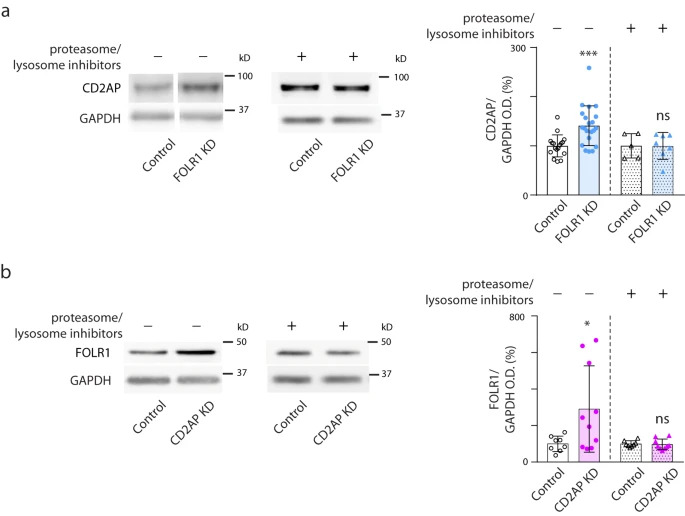 Fig. 8: FOLR1 and CD2AP reciprocally regulate their protein turnover. Two-cell stage Xenopus laevis embryos were microinjected with 14.8pmol Control-morpholino (MO, Control, a, b), 3.2pmol FOLR1-MO (FOLR1 KD, a) or 14.8pmol CD2AP-MO2 (CD2AP KD, b) per embryo and incubated with saline or proteasome and lysosome inhibitors at the end of gastrulation (stage 12) until neural plate stages (stage 17) when they were processed for Western blot assays. Images are examples of Western blot assays. Graphs show individual and meanSD percent of optical density (OD) for CD2AP (a) or FOLR1 (b) immunoblot band normalized with GAPDH protein band OD and compared to controls. In (a), n=34 and 42 neural plates for Control and FOLR1 KD, respectively, N=7 independent experiments; n=20 and 26 neural plates for Control+inhibitors and FOLR1 KD+inhibitors groups, respectively, N=3 independent experiments. In (b) n=16 and 20 for Control and CD2AP KD groups, respectively and n=16 and 18 neural plates for Control+inhibitors and CD2AP KD+inhibitors, respectively, N=3 independent experiments. In (a, b) *p<0.05, ***p<0.001, ns: not significant, two-tailed ratio t-test. Source data are provided as a Source Data file. |