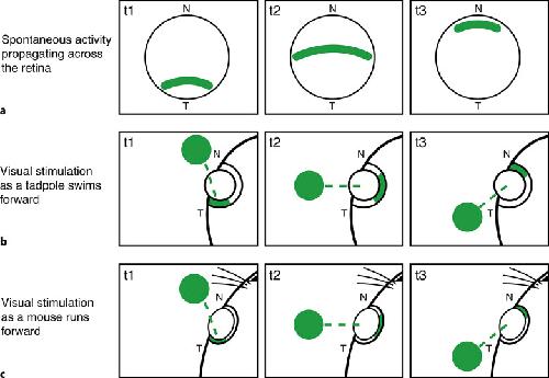 Fig. 2. Temporal-to-nasal patterned retinal activity – whether spontaneous or evoked by light. a Spontaneous retinal waves stereotypically propagate from the temporal side of the retina to the nasal side. b As a tadpole swims forward, the visual scene stimulates the retina in the same temporal-to-nasal manner. c Similarly, the visual environment stimulates the mouse’s retina temporally-to-nasally as the mouse runs forward. Figure produced by Mr. Erick Fernandez de Arteaga.