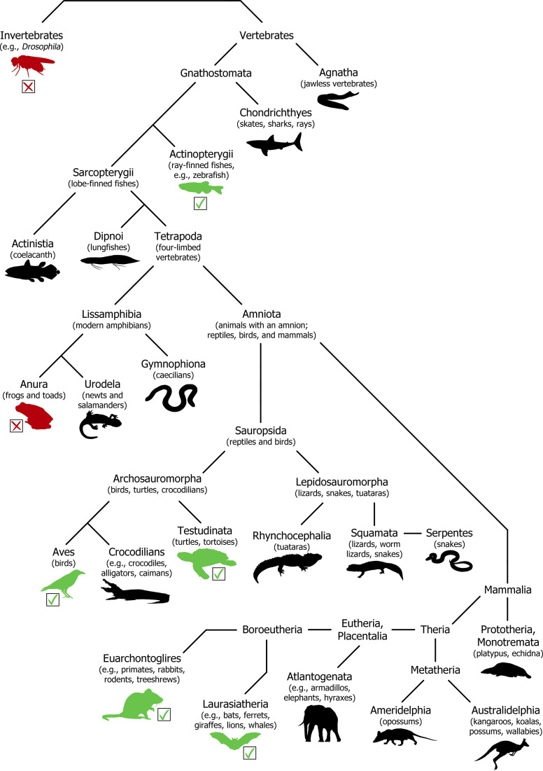 Fig. 1. Cladogram depicting the study of spontaneous retinal waves across species. A green silhouette and check indicates retinal waves have been observed in this phylogenetic group. A red silhouette and cross indicates that observations have failed to detect retinal waves in this group. To our knowledge, retinal waves have not been studied in any taxonomic group besides those indicated here.