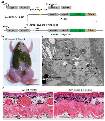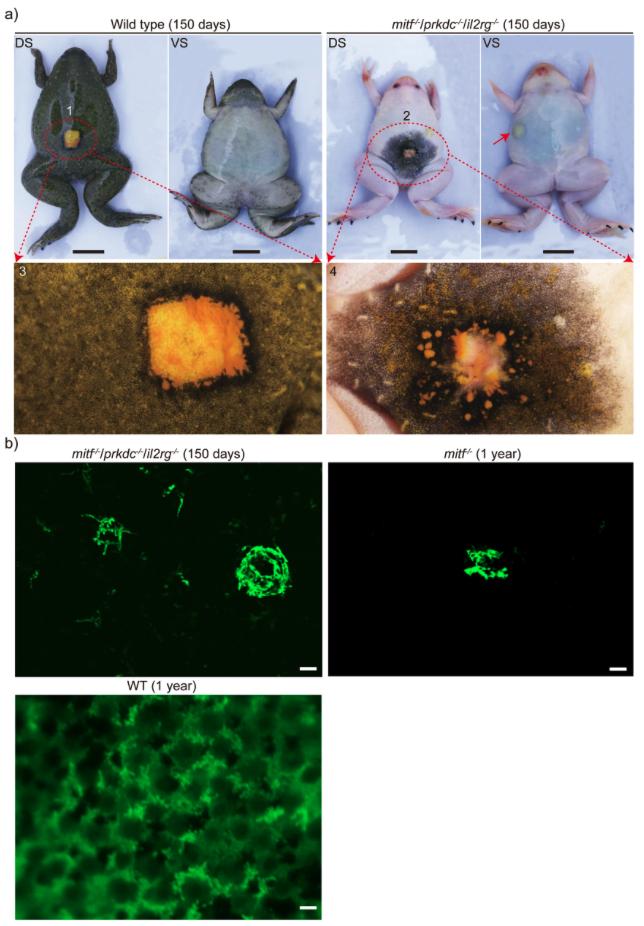 Revealing mitf functions and visualizing allografted tumor metastasis in colorless and immunodeficient Xenopus tropicalis.