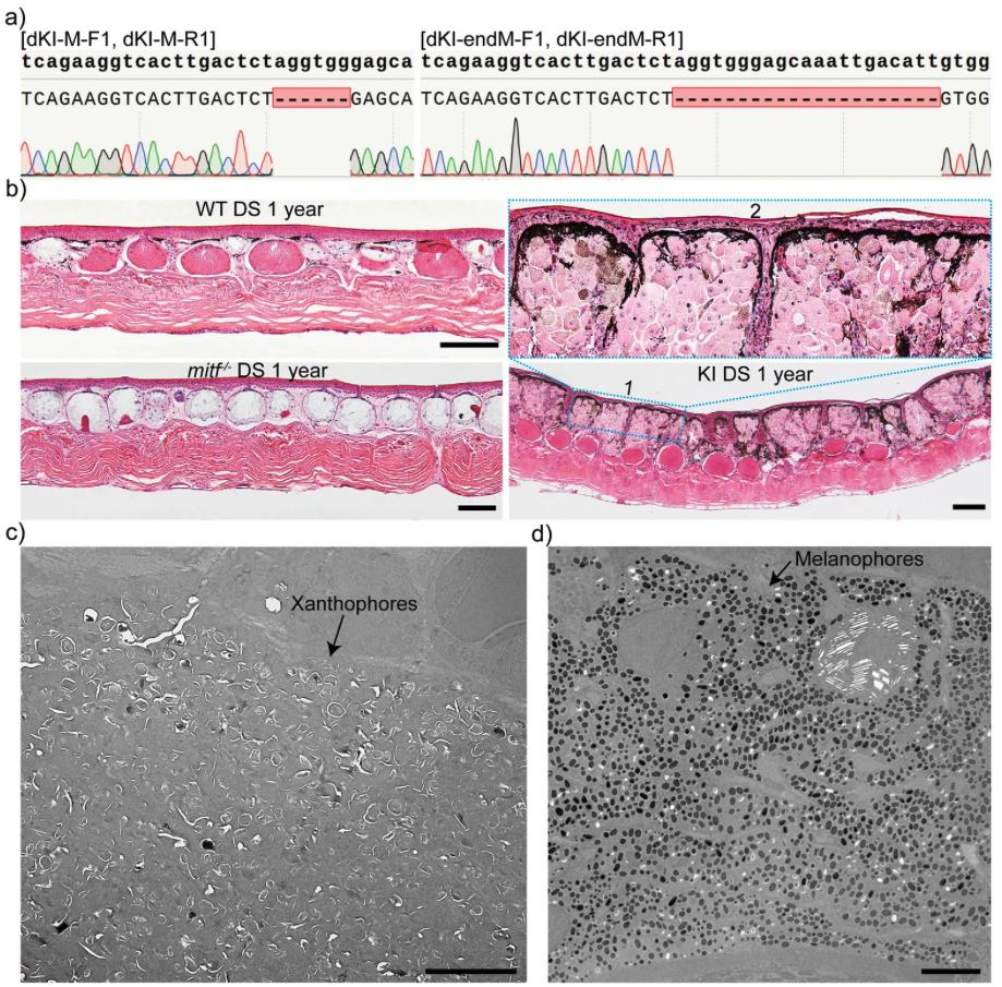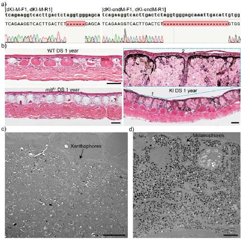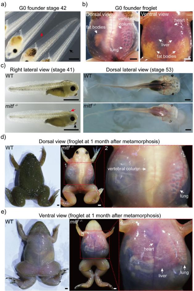 Fig. 1: Biallelic mitf disruption makes Xenopus tropicalis transparent within two months post-metamorphosis. a After using the CRISPR/Cas9 system to knock out mitf via gRNA T7, founder generation (G0) mosaic tadpoles at stage 42 exhibited a loss of melanophores (indicated by red arrow), compared to wild type (WT) tadpoles from the same batch (indicated by black arrow). 79 mosaic tadpoles and 20 wild type tadpoles were observed. b One month after metamorphosis, the transparent skin of the mosaic froglet allowed for external visibility of internal organs such as the fat bodies, lung, liver, heart, and vertebral column. Here was shown one representative froglet, out of a total of 11 mosaic froglets. c The F1 mitf−/− Xenopus tropicalis tadpole exhibited melanophores loss throughout the entire body at stages 41 and 53 compared to wild type tadpoles from the same batch. Notably, at stage 41, the melanin pigmentation in the eyes of mitf−/− Xenopus tropicalis was generated by retinal pigment epithelium (RPE) cells, and redistribution of melanin in oocytes resulted in some melanin pigment in the head (indicated by red arrow) and cement gland (indicated by black arrow). However, the melanin pigment in the head and cement gland disappeared in later development stages, such as stage 53. Representative photographs were exhibited from 35 F1 mitf−/− Xenopus tropicalis tadpoles at stage 41, 15 F1 mitf−/− Xenopus tropicalis tadpoles at stage 53, as well as from 10 wild type tadpoles each at stage 41 and 53. d, e One month after metamorphosis, the F1 mitf−/− Xenopus tropicalis froglet exhibited transparent skin from both dorsal (d) and ventral (e) views. Red dashed boxes 2 and 4 corresponded to magnified views of red dashed boxes 1 and 3, respectively. The transparent skin allowed for external visibility of internal organs including the lung, liver, heart, and vertebral column within one month after metamorphosis as shown. Ten F1 mitf−/− Xenopus tropicalis froglets and ten wild-type Xenopus tropicalis froglets were used to provide representative photographs as shown. Each scale bar is 1 mm. |