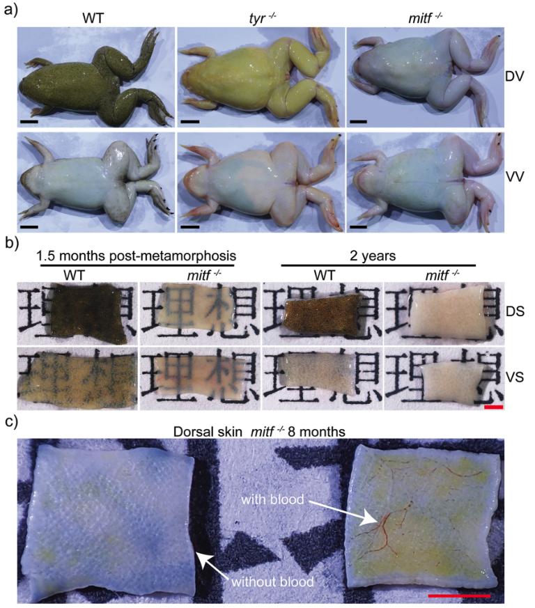 Fig. 2: The skin of mitf−/− adult frogs turns colorless and opaque. a The representative photographs of adult wild type (WT), tyr−/−, and mitf−/− Xenopus tropicalis were displayed to showcase their dorsal view (DV) and ventral view (VV). The photographs were obtained from a sample of 15 adult frogs of each genotype, all of which were 1 year old. b Skin samples approximately 2 mm×5 mm in size were obtained from both dorsal skin (DS) and ventral skin (VS) of wild-type and mitf−/− Xenopus tropicalis aged 2 years or 1.5 months postmetamorphosis. These samples were utilized in transillumination experiments to assess their translucency properties. Specifically, the experiment involved positioning each sample on a sheet of paper with the word “理想“ and photographing them under consistent lighting and camera settings to assess the visibility of the word. Three frogs were used for each genotype, and one sample of DS and VS skin was collected per frog. Representative photographs of each genotype were presented to illustrate the experimental findings. c Skin samples were obtained with blood or after exlusion of blood from dorsal regions of the same mitf−/− Xenopus tropicalis aged 8 months. Three frogs were used for this experiment. The representative photograph was presented. The black scale bar in a is 1 cm. The red scale bar in b and c is 1 mm. |