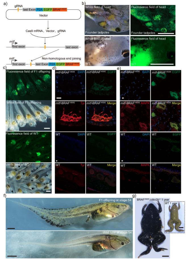 Fig. 6: The integration of the BRAFT1799A within the mitf locus elicits spontaneously formed melanophores-related nevi and xanthophores-like moles in Xenopus tropicalis. a The strategy of precisely integrating the human BRAFT1799A mutation into the mitf genomic locus through non-homologous end joining repair mediated by CRISPR/Cas9 has been demonstrated. This involves placing the mutation downstream of the last exon of mitf, thereby utilizing the endogenous promoter of mitf to drive BRAFV600E expression. b At stage 56, following precise integration of human BRAFT1799A into the mitf genomic locus, the founder generation tadpoles exhibited a mosaic phenotype characterized by aberrant proliferation of melanophores and xanthophores. Additionally, a significant proliferation of xanthophores was observed using spontaneous green fluorescence. The control group exhibited the absence of this phenotype in WT tadpoles. A total of eight such tadpoles were observed at this stage. c Compared to the control group of WT tadpoles, the F1 generation mitf-BRAFV600E tadpoles at stage 46 were observed and found to exhibit EGFP signals. d, e Immunofluorescence analysis was performed on three tail samples obtained from three stage 56 mitf-BRAFV600E tadpoles from the F1 generation. Every sample was fixed, embedded, and sectioned into six paraffin slices for the analysis. The results demonstrated co-localization of Tyr and EGFP (d), as well as co-localization of EGFP and MAPK signaling pathway activation (e). The WT control group showed an absence of EGFP signals, and cells with activated MAPK pathway were also scarce. The activation of the MAPK signaling pathway was evidenced by positive fluorescence signal of the antibody-ERK1 + ERK2. The images presented here were representative of the observed results. f A typical photograph of F1 mitf-BRAFV600E tadpoles at stage 54 and the corresponding batch of WT tadpoles was presented. g Compared to a 1-year-old WT frog, a representative image of a 1-year-old cdkn2b+/−;mitf-BRAFV600E frog showed spontaneously formed nevi and xanthophoromas. Scale bar in b, 2 mm; Scale bar in c, 1 mm; Scale bar in d and e, 10 μm; Scale bar in f, 5 mm; Scale bar in g, 1 cm. |