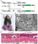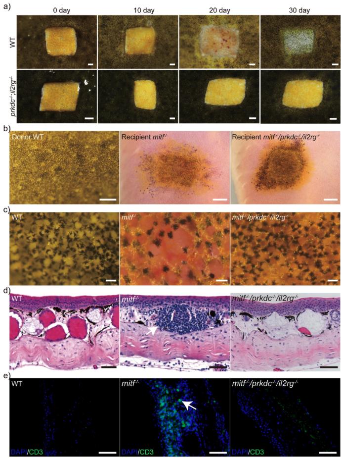 Fig. 8: The mitf/prkdc/il2rg triple-knockout results in the creation of a line of colorless and immunodeficient Xenopus tropicalis. a Three WT and three prkdc−/−/il2rg−/− Xenopus tropicalis aged 6 months were used as transplant recipients. The donors were three tyr−/− Xenopus tropicalis aged 2 years, and their dorsal skins were grafted onto the recipients’ dorsal skin. The grafting outcomes were monitored for a 30-day period post-transplantation. The representative results were presented here and the transplanted donor skins were approximately 5 mm × 5 mm in size. b–e Three mitf−/− and three mitf−/−/prkdc−/−/il2rg−/− Xenopus tropicalis froglets were selected as transplant recipients at the age of two months. The donor skins were obtained from three WT Xenopus tropicalis at the same age and were grafted onto the dorsal skin of the recipients. The transplanted donor skins were approximately 3 mm×3 mm in size, and the WT skin and representative photos of the transplanted donor skins were taken on the 52nd day post-transplantation (b). The magnified view of the corresponding skin in b was shown in c. d The histological structure of the corresponding skin in c was presented through histological examination of 18 paraffin sections from the collected sample, which provided the representative results presented here. e T cell infiltration following skin allografts in mitf−/− and mitf−/−/prkdc−/−/il2rg−/− Xenopus tropicalis. T cells were labeled with the CD3 antibody, and cell nuclei were stained with DAPI. The sample preparation method was the same as for d. Scale bar in a and b, 1 mm; Scale bar in c, 100 μm; Scale bar in d and e, 50 μm. |