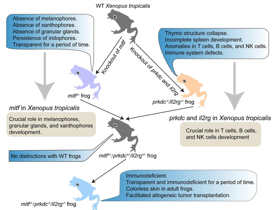 Fig. 11: Schematic of mitf−/−/prkdc−/−/il2rg−/− Xenopus tropicalis construction. The process revealed the crucial role of mitf in the development of melanophores, xanthophores, and granular glands. The resulting mitf−/−/prkdc−/−/il2rg−/− Xenopus tropicalis is suitable for research on allograft tumor transplantation. |