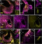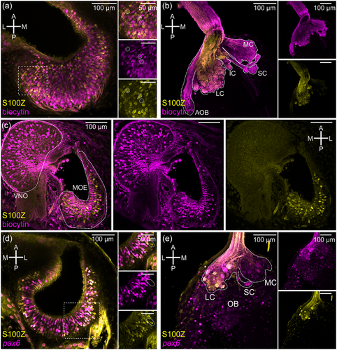 FIGURE 4 Mature and immature receptor neurons express S100Z exclusively in the MOE and not in the VNO of X. laevis tadpoles. (a) Biocytin-streptavidin-stained ORNs (magenta) and S100Z-positive ORNs (yellow) were present throughout the whole MOE. Some ORNs showed co-localization with both proteins (highlighted with circles). (b) The axonal projection of biocytin-streptavidin labeled ORNs (magenta) was found in all glomerular clusters within the main OB and AOB of X. laevis tadpoles, but axonal projection of S100Z-positive neurons (yellow) was exclusively detected in the LC and IC. (c) Biocytin-streptavidin stained ORNs (magenta) were located in the VNO and MOE of X. laevis tadpoles. S100Z-expressing neurons (yellow) occurred in the MOE. (d) Immature pax6-positive cells (magenta) and S100Z-positive ORNs (yellow) were present throughout the whole MOE. Although many, not all cells were double positive (e.g., white dotted oval). (e) Axonal projections of pax6-positive neurons, indicating an immature status, were detected in the LC and MC within the glomerular layer and different cell types (magenta) within the OB. Some, but not all glomeruli within the LC, showed co-localization for S100Z and pax6. A, anterior; AOB, accessory olfactory bulb; IC, intermediate cluster; L, lateral; LC, lateral cluster; M, medial; MC, medial cluster; MOE, main olfactory epithelium; OB, olfactory bulb; ON, olfactory nerve; ORN, olfactory receptor neuron; P, posterior; SC, small cluster; VNO, vomeronasal organ. |