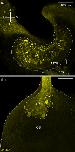 Distinct, but partially overlapping expression patterns of calretinin/S100Z. (a) In premetamorphic X. laevis, ORNs across the whole MOE expressed calretinin (magenta) and S100Z (yellow). Not all but many cells showed co-localization of the two calcium-binding proteins (e.g., white dotted circles). (b) In premetamorphic animals, the axonal projection of calretinin-expressing neurons (magenta) targeted the AOB, LC, and MC. Within the LC, calretinin- and S100Z-positive (yellow) glomeruli were detected and some were double-positive (white dotted ovals). (c) Expression patterns of calretinin (magenta) and S100Z (yellow) in glomeruli of the lateral cluster in four different premetamorphic animals. The expression patterns were very variable between individuals, but some trends for recurring patterns were apparent. The outer lateral glomeruli within the LC had the tendency to be either S100Z- or calretinin-positive (asterisks), whereas in the medial part of the LC, more glomeruli were S100Z-positive. The most caudal glomerulus in the middle of the LC was often double positive for S100Z/calretinin (arrows). (d) Immunohistochemical staining for calretinin (magenta) labeled neurons throughout the whole VNO in premetamorphic animals, but no S100Z expression (yellow) was found in the VNO. A anterior; AOB, accessory olfactory bulb; L, lateral; LC, lateral cluster; M, medial; MC, medial cluster; MOE, main olfactory epithelium; ORN, olfactory receptor neuron; P, posterior; VNO, vomeronasal organ. |