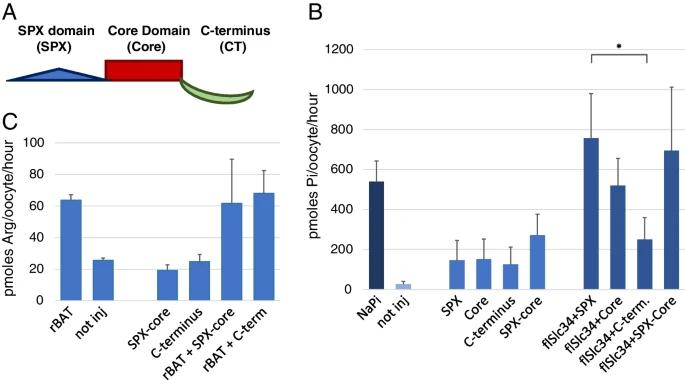 Pi uptake into oocytes expressing XPR1 protein domains. A Schematic representation of XPR1 with the domains SPX, core and C-terminus. B Cells were injected with constructs of XPR1 domains; SPX domain, core domain, the C- terminus and XPR1 without C-terminus (SPX-core) and assayed after 5 days. C The effect is specific for Pi transport as expression of XPR1 fragments has no effect on.3H arginine uptake into oocytes (representative experiment of 3 repetitions is shown). One-way ANOVA with Tukey’s post hoc test, *p < 0.05