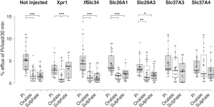 Efflux measurements with oocytes expressing potential Pi exporters. Anion exchangers were identified as potential Pi exporters based on substrate specificity and expression pattern. The transporters (Slc26A1, Slc29A3, Slc37A3 and Slc37A4) were expressed in oocytes, and efflux was assessed in the presence of 2 mM Pi, 50 µM oxalate or 2 mM suphate. Whereas the exogenous exchangers did not show enhanced export activity, though intrinsic export shows preference of Pi over oxalate and sulphate. One-way ANOVA with Tukey’s post hoc test, *p < 0.05, **p < 0.01, ***p < 0.001