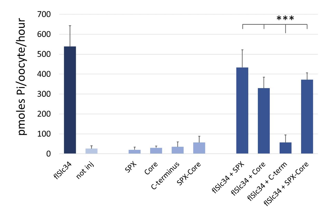 Supplementary Figure 4: Pi uptake into oocytes expressing XPR1 protein domains. Cells were injected with constructs of XPR1 domains; SPX- domain, core domain, the C- terminus and XPR1 without C- terminus (SPX-core) and assayed after 5 days. In addition, oocytes were incubated in 1 mM Pi for 20’ prior to the uptake. The pre-incubation reduced the variability between individual oocytes, all groups were similarly affected. (This figure compares to Figure 5B in the main text.) One-Way ANOVA with Tukey’s post hoc test, *** = p<0.001.