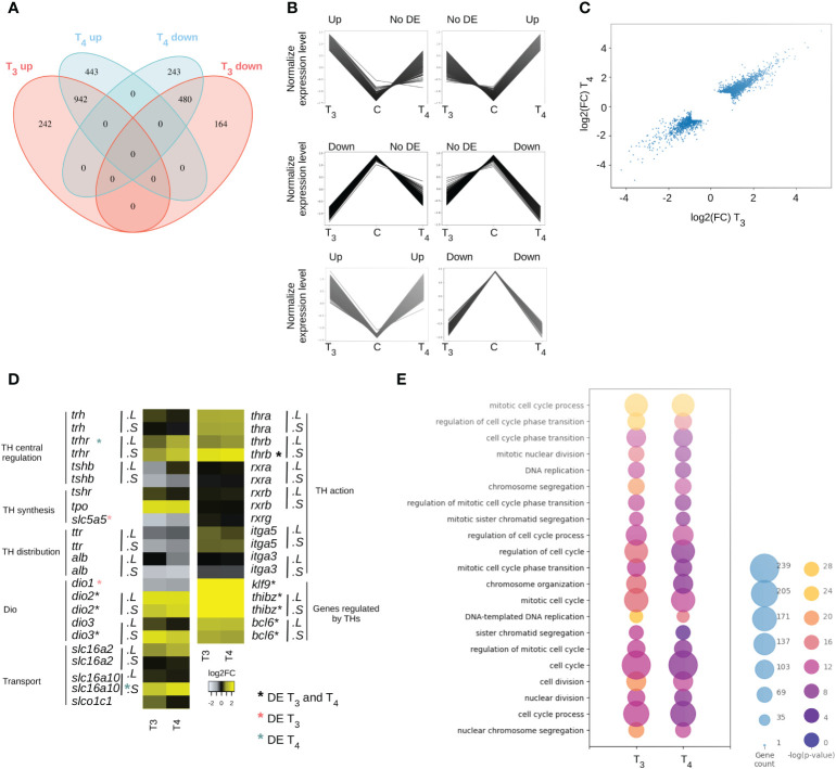 Thyroid hormones are involved in many biological processes such as neurogenesis, metabolism, and development. However, compounds called endocrine disruptors can alter thyroid hormone signaling and induce unwanted effects on human and ecosystems health. Regulatory tests have been developed to detect these compounds but need to be significantly improved by proposing novel endpoints and key events. The Xenopus Eleutheroembryonic Thyroid Assay (XETA, OECD test guideline no. 248) is one such test. It is based on Xenopus laevis tadpoles, a particularly sensitive model system for studying the physiology and disruption of thyroid hormone signaling: amphibian metamorphosis is a spectacular (thus easy to monitor) life cycle transition governed by thyroid hormones. With a long-term objective of providing novel molecular markers under XETA settings, we propose first to describe the differential effects of thyroid hormones on gene expression, which, surprisingly, are not known. After thyroid hormones exposure (T3 or T4), whole tadpole RNAs were subjected to transcriptomic analysis. By using standard approaches coupled to system biology, we found similar effects of the two thyroid hormones. They impact the cell cycle and promote the expression of genes involves in cell proliferation. At the level of the whole tadpole, the immune system is also a prime target of thyroid hormone action.