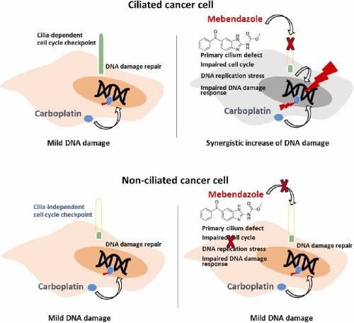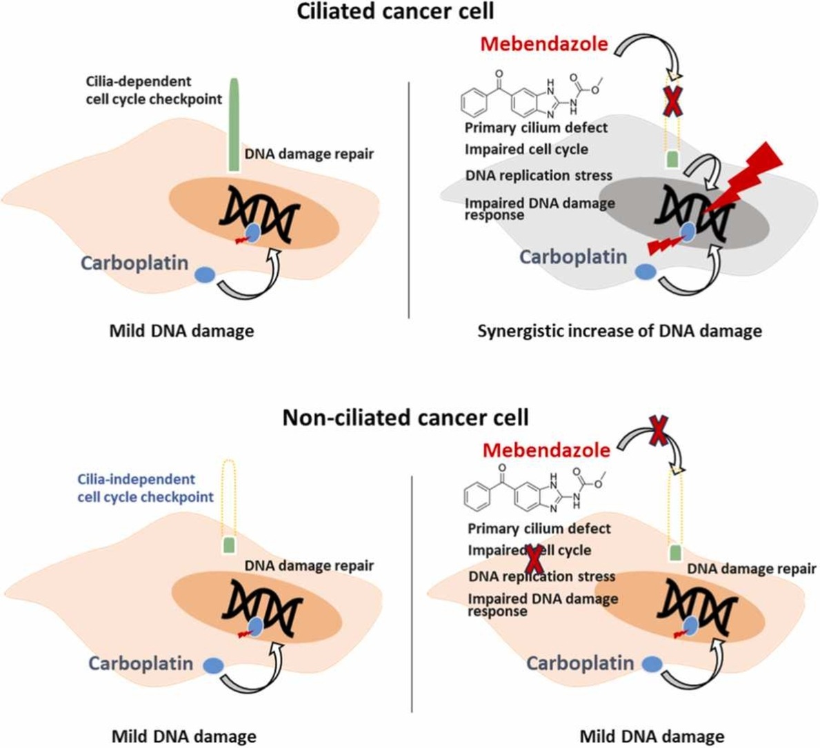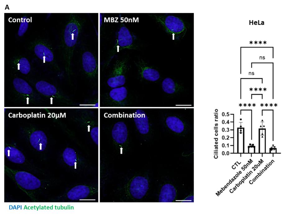 (A) HeLa cells were treated with DMSO (CTL), MBZ, carboplatin, or a combination of MBZ and carboplatin at the indicated concentrations for 48 h under low-serum conditions. Cilia were visualized with anti-acetylated tubulin antibody (green), and nuclei were labeled with DAPI (blue). Scale bar = 10 µm.
