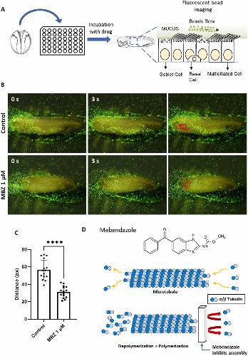Fig. 1. Mebendazole treatment disrupted cilia-mediated fluid flow in Xenopus laevis embryos. (A) Schematic illustration of the drug screening procedure using Xenopus embryos. Xenopus embryos were nourished in a drug-containing multi-well plate for 24 h, and fluid flow over the embryonic epidermis was monitored using fluorescein-conjugated latex beads. (B) Stage 17 embryos were incubated with mebendazole for 24 h. Fluorescein-conjugated latex beads were loaded on top of the head of the embryos, and the bead flow was recorded. The red lines on the right panels represent the tracking paths of individual fluorescent beads. (C) The lengths of the tracking paths (distance) in panel B were plotted. Error bars represent mean ± standard deviation. P values were determined by two-tailed t-tests (****P < 0.0001). (D) Schematic illustration of mebendazole structure and a suggested mechanism inhibiting microtubule polymerization. |