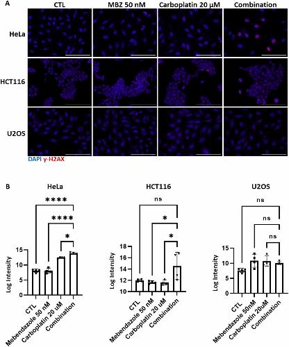 (B) Statistical analysis of γ-H2AX intensity in cells treated with DMSO, MBZ, carboplatin, or a combination of MBZ and carboplatin (n=8). The data are presented in the form of logarithmic fluorescent intensity. Error bars represent mean ± standard deviation. P values were calculated by ordinary one-way ANOVA.