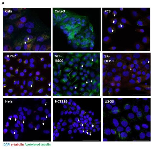 Several types of cancer cell lines were tested for cilia formation by incubating in low-serum media for 48 h. The primary cilium was labeled with acetylated tubulin (green and white arrows). The basal body/centrosome was labeled with γ-tubulin (red). Nuclei were labeled with DAPI (blue). Caki, PC3, HEPG2, NCI-H460, SK-HEP, HCT116, and HeLa cells showed evident formation of primary cilia, whereas U2OS cells were not able to induce ciliogenesis.