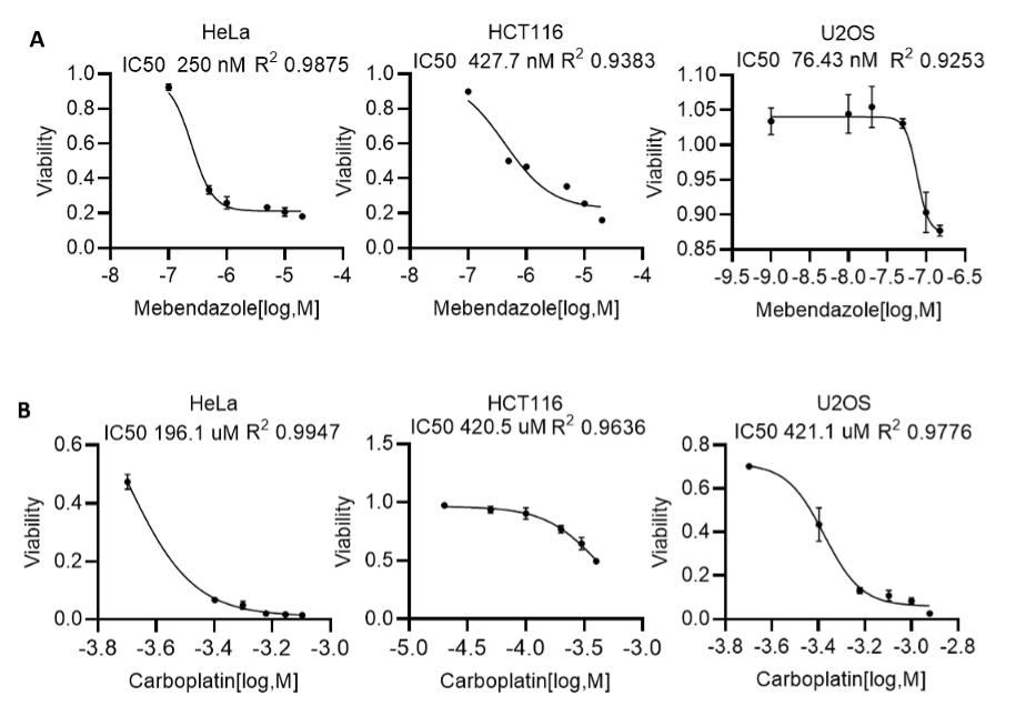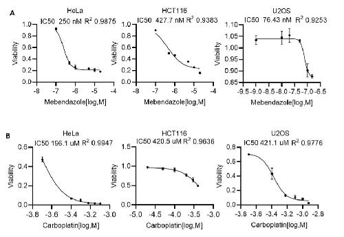The viability of the indicated cancer cell lines under increasing doses of MBZ (A) or carboplatin (B) was analyzed, and the IC50 value was calculated.
