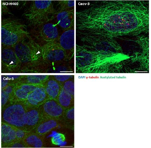 NCI-H460, Caov-e, and Calu-3 cancer cell lines were tested for cilia formation by incubating in low-serum media for 48 h. The primary cilium was labeled with acetylated tubulin (green and white arrows). The basal body/centrosome was labeled with γ-tubulin (red). Nuclei were labeled with DAPI (blue). NCI-H460 cells occasionally formed primary cilia, while Caov-3 and Calu-3 cells did not.