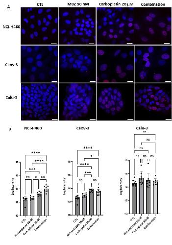 (A) NCI-H460, Caov-3, and Calu-3 cells were treated with DMSO (CTL), MBZ, carboplatin, or a combination of MBZ and carboplatin at the indicated concentrations for 48 h under low-serum conditions. DNA damage was visualized with anti-γ-H2AX antibody (red), and nuclei were labeled with DAPI (blue). Scale bar = 20 µm.