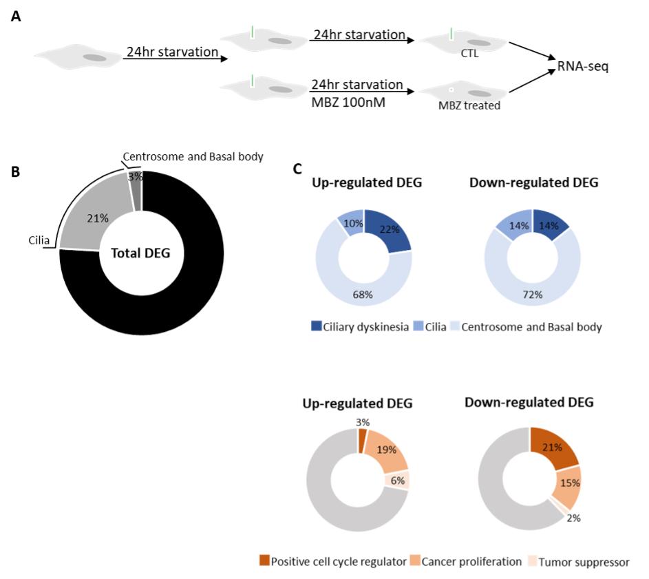 (A) RPE1 cells were serum starved for cilia induction and then treated with either DMSO or 100 nM MBZ. After 24 h incubation and RNA extraction, RNA sequencing was performed as described in the methods.