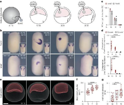 Fig. 1: Loss of neural crest competence correlates with increased hydrostatic pressure. a, Schematic of neural crest ectopic induction assay using DLMZ as the inducer (grey), grafted into host blastocoel cavity (red). b, In situ hybridization analysis of foxd3 and snai2 at stage (St) 17 and 18, respectively, seen in ventral view and dorsal view as inset. c, Spread of data indicating the percentage of embryos with ectopic induction analysed with different neural crest (NC) markers. d, Quantification of neural crest competence at the indicated stages; 10, 11 and 12 normalized to control with no graft. Embryos that exhibited ectopic induction are represented as Ectopic+ (red), and embryos with no ectopic induction are shown as Ectopic (black). e, Micro-CT of a whole mount embryo (grey) at stages 10, 11 and 12 showing blastocoel cavity (red). f,g, Quantification of blastocoel volume (f) and hydrostatic pressure (g) at stages 1012. Scale bars, 450um for ventral and 200um for dorsal (b) and 300um (e). Statistical analysis was performed using two-sided Dunnetts tests (*P=0.0164 (g), ****P0.0001 (d,f), 95% CI). Data are mean and s.d. (c). Box plots (f,g) show median, 25th and 75th percentiles, and whiskers extending to minimum and maximum values. Three independent experiments (c,d). n=17 st10, 19 st11 and 12 st12 embryos (f) and n=19 st10, 13 st11, and 22 st12 embryos (g). |