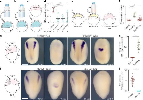 Fig. 3: Hydrostatic pressure controls neural crest competence. ac, Schematic of inflating embryo with hypotonic (a), hypertonic (b) and blastocoel fluid (c). d, Spread of data points comparing the change in snai2 expression at stage 14. e, Schematic of reinflating an embryo to normal blastocoel size after deflation with a saline solution. f, Spread of data points comparing changes in snai2 expression at stage 14. g,i, Left to right: the schematic of DLMZ graft assay into stage 12 and 10 embryos, respectively and analysed via ISH for snai2 at stages 18 and 16, respectively. h,j, Quantification of neural crest competence assay during deflation (h) and inflation (j) of Xenopus embryos. Scale bar, 450um (g,i). Data are mean and s.d. Statistical analysis was performed using two-sided Dunns test and unpaired t-tests (NS, P=0.2590 (f), ***P=0.0001 (d), ****P0.0001 (d,f,h,j), 95% CI). n=9 control, 10 hypotonic, 8 hypertonic and 13 blastocoel embryos (d), n=10 control, 1 deflation and 23 reinflation embryos (f), n competence=16 control and deflation embryos (h), n competence=18 control and inflation embryos (j). |