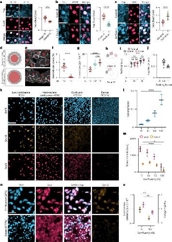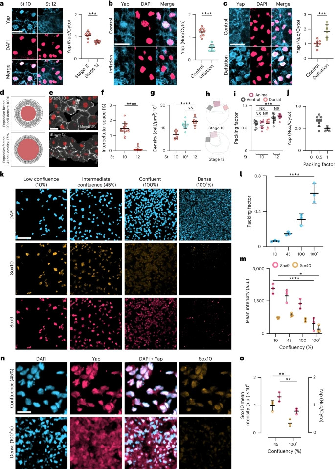 Fig. 5: Hydrostatic pressure controls Yap localization. a–c, Immunofluorescence of ectoderm showing Yap (blue) and DAPI (pink) during gastrulation (a) inflation (b), and deflation (c); graphs show quantification of the Yap nuclear-to-cytoplasmic (Nuc/Cyto) ratio. d, Particle-based 2D model illustrating how an expanding cavity (red) can compress surrounding cells (light-grey circles) if they are encapsulated by a stiff shell (the vitelline membrane, dark-grey outer layer). Dark-grey connection lines between cells indicate adhesive interactions. e, Immunofluorescence sections of the ectoderm expressing membrane GFP (grey) and stained for DAPI (red). f,g, Spread of data showing the percentage of intercellular space (f) and density (g). 10* indicates inflated embryos at stage 10 (cyan) and control embryos (red) at the indicated stages. h, Schematic of embryos indicating the regions of interest of ectoderm for analysis of ectoderm packing quantified in i. j, Spread of data indicating the relationship of ectoderm packing and Yap localization. k, Immunofluorescence of different confluences of iNCCs expressing Sox9 (pink) and Sox10 (orange). l,m, Spread of data showing different cell packing and mean fluorescence intensity at different densities. n, Immunofluorescence of Yap (pink) and Sox10 (orange) localization at different confluences of iNCCs. o, Spread of data showing mean fluorescence intensity of Sox10 and Yap at different densities. Scale bars, 20 µm (a–c,e), 100 µm (k) and 65 µm (n). Data are mean and s.d. Statistical analysis was performed using a two-sided two-tailed Student’s t-test and Dunnett’s test; (NS, P ≥ 0.1408 (j,l), *P = 0.0168 (m), ***P ≤ 0.0010 (a–c,i) and ****P = 0.0001 (b,f,g,l,m), 95% CI). Three independent experiments (i,j,l,m,o). n = 9st10, 6st12 embryos (a), n = 9control, 7inflation embryos (b), n = 8control, 8deflation embryos (c), nst10 and nst12 = 20 embryos (f), and nst10 = 9, nst10* = 10, nst12 = 9 embryos (g). |