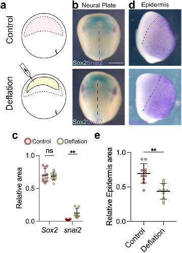 Extended Data Fig. 7 Deflation expands neural crest at the expense of epidermis. a, Schematic of deflation assay to reduce blastocoel volume. b, Double in situ hybridization of neural plate marker (Sox2, cyan) and neural crest marker (snai2, purple). c, Spread of data points comparing the relative area of the neural plate in control (n = 8 embryos) and deflation (n = 11 embryos). d, In situ hybridization of epidermis marker (keratin, purple). e, Spread of data points of relative area of epidermis in control (n = 10 embryos), and deflation (n = 20 embryos). Embryos in (b) and (d) were analyzed at stage 14. Scale bar 450 µm (b). Data (c, e) represent mean, error bars are s.d. Statistical analysis was performed using a two-sided unpaired student t-test (NS, P = 0.0626; c and **P = 0.0017; c and e, CI = 95%). |
