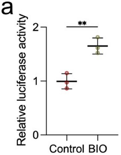 Extended Data Fig. 9 Control for TOP-flash assay. a, Data spread indicates relative Wnt activity in control embryos and in embryos treated with BIO. BIO is an inhibitor of GSK3, which should lead to an increase in Wnt activity. Each data point represents three replicates, and each condition represents three independent experiments. Data represent mean, error bars are s.d. Statistical analysis was performed using two-sided student t-test (**P = 0.0053, CI = 95%). |