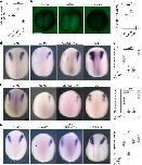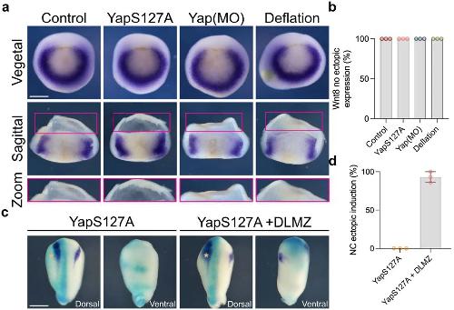Extended Data Fig. 10 Neural crest ectopic induction mediated by nuclear Yap. a, In situ hybridization of mesodermal marker (Wnt8) at different treatments. b, Percentage of no observable ectopic Wnt8 expression. c, Competence assay analyzed via in situ hybridization. Co-injection on one side of embryos of FLDX (cyan) and active Yap analyzed via snai2 (purple) at stage 17. d, Percentage of ectopic neural crest expression. Scale bar 450 µm (a and c). Data (d) represent mean, error bars are s.d. Three independent experiments. |