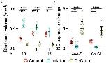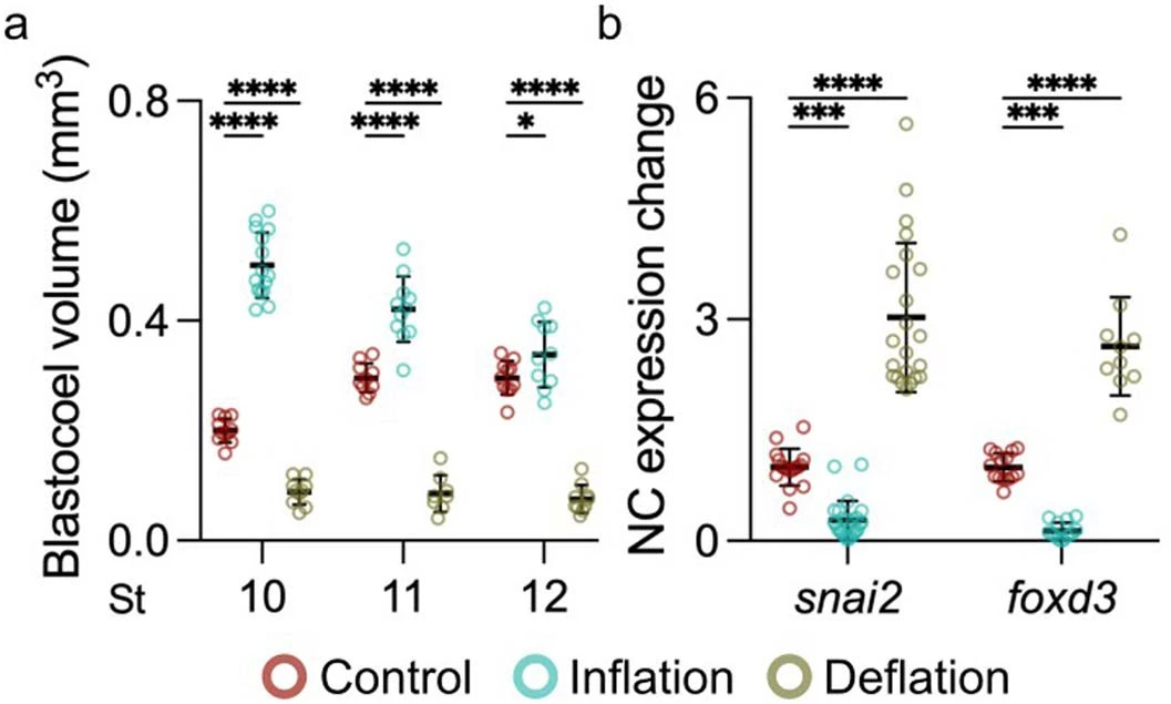 Extended Data Fig. 3 Manipulation of blastocoel volume during gastrulation. a, Spread of data points indicating change in volume between control, inflation, and deflation at stage 10 (n = 11, 15, 10 embryos, respectively), 11 (n = 10, 11, 8 embryos, respectively), and 12 (n = 11, 10, 10 embryos, respectively). b, Quantifying snai2 and foxd3 expression levels by ISH after indicated treatment. Data represent mean, error bars are s.d. Statistical analysis was performed using two-sided Dunnett’s test (*P = 0.0106; a, ***P = 0.0001; b, ****P ≤ 0.0001; a and b, CI = 95%). nsnai2 = 22control, 25inflation, 22deflation, nfoxd3 = 22control, 14inflation, 10deflation embryos (b). |