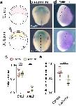 Extended Data Fig. 1 Analysis of neural crest competence. a, Schematic of neural crest ectopic induction via DLMZ assay, where stage 10 donor embryo injected with FLDX as a lineage tracer (cyan) in two blastomeres at the 2-cell stage. b, In situ hybridization of snai2 at stage 16, showing embryos with dorso-lateral and ventral ectopic induction. When the grafted tissue was located next to the host neural crest, we observed expansion in the markers, whereas when the graft was ventral, we observed proper ectopic induction; only the latter was considered in the analysis. c, Percentage of embryos exhibiting either ventral or dorso-lateral ectopic induction. d, In situ hybridization of Wnt8 positive animal and ventral sides after grafting the DLMZ into the blastocoel cavity. f, Percentage of embryos exhibiting either positive or negative ectopic Wnt8 expression. Histograms represent mean, error bars are s.d. Panels represent three independent experiments. Scale and 400um (b) and 350um (d and e). Three independent experiments (c, f). |