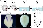 Extended Data Fig. 8 Mechanical pressure inhibits neural crest. Schematic of in vitro compression assay of neural crest explants; explants with prospective neural crest were obtained by initial dissection from dorsal blastopore lip to ventral side followed by dissection from animal pole to ventral side. Explants were then compressed under a coverslip, and compressed explants were cultured until stage 18, and the expression of the neural crest marker snai2 was analyzed. b, Representative examples of control (not compressed) and experimental (compressed) explants showing snai2 expression. c, Spread of data points comparing the neural crest expression marker in control (n = 11 explants) and compressed (n = 11 explants) conditions. Scale bar 400 µm (b). Data represent mean, error bars are s.d. Statistical analysis was performed using a two-sided unpaired student t-test (***P = 0.001; c, CI = 95%). |