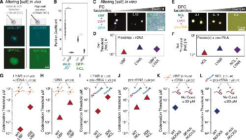 Figure 5. Complex coacervation underlies condensation of nucleoli in cells and nucleolar components in vitro(A) Schematic of injections of isotonic (light gray) or high salt (dark gray) solutions into isolated Xenopus GVs expressing mCherry-UBF and GFP-NCL; resultant KCl concentrations in GVs are predicted to be 100 and 200 mM, respectively. Confocal images shown are taken 5 min after injections.(B) Quantification of partition coefficients of mCherry-UBF in FCs and GFP-NCL in FC/DFCs relative to the surrounding nucleoplasm (n > 20); isotonic and high salt treatments are compared, ***p value < 1.00e–05.(C) Salting-in behaviors of three-component condensates comprising UBF (0.1 μM), LYAR (0.25 μM), and rDNA (5 μM [nt])) measured at the indicated salt concentrations. Representative confocal images of all three components (merge) are shown.(D) Threshold salt concentration for condensation of indicated two- and three-component mixtures.(E) Salting-in behaviors of three-component condensates comprising NCL (2 μM), LYAR (0.25 μM), and pre-rRNA (5 μM [nt])) measured at the indicated salt concentrations. Representative confocal images of all three components (merge) are shown.(F) Threshold salt concentration for salting-in of condensates indicated for two- and three-component mixtures.(G and H) (G) Condensate thresholds of UBF and ΔD/E-UBF in three-component condensates with rDNA (5 μM [nt]) and LYAR (0.1 μM) or (H) two-component condensates with rDNA (5 μM [nt]).(I and J) (I) Condensate thresholds of NCL and ΔD/E-NCL in three-component condensates with pre-rRNA (5 μM [nt]) and LYAR (0.1 μM) or (J) two-component condensates with pre-rRNA (5 μM [nt]).(K) Condensation thresholds of WT NUCKS and ΔK-rich NUCKS in three-component condensates with rDNA (5 μM [nt]) and UBF (0.05 μM) or (L) in three-component condensates with pre-rRNA (5 μM [nt]) and NCL (1.5 μM).See also Figure S5. |