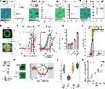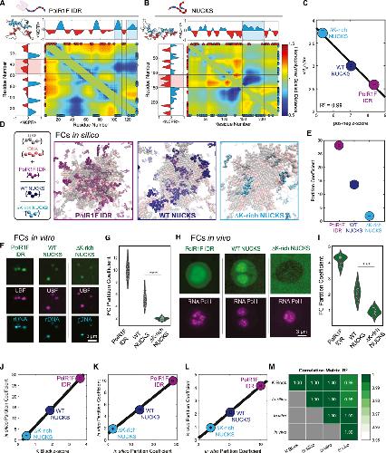 Figure 6. K-blocks within FC/DFC proteins drive enrichment and partitioning into FC in cells and their facsimiles in vitro(A and B) Sequence-specific inter-residue distance maps from atomistic simulations shown as normalized quantities, with respect to the best fit homopolymer model for PolR1F IDR (A) and WT NUCKS (B). Positive and negative residues are shown as circles in blue and red, respectively.(C) Comparison of positive-negative (pos-neg) patterning Z score and sequence length (N) normalized radius of gyration (Rg) (R2 = 0.99 for linear regression). Error bars indicate standard errors from the mean across five independent simulations.(D) Representative snapshots from LaSSI simulations of simulated FCs involving UBF with rDNA and either PolR1F IDR, WT NUCKS, or ΔK-rich NUCKS; snapshots are a zoom-in of the entire simulation box, wherein spherical condensates are formed.(E) Calculated partition coefficients (PCs) of PolR1F IDR, WT NUCKS, or ΔK-rich NUCKS into simulated FCs. Error bars indicate standard errors from the mean across ten replicates.(F) Confocal images of three-component FC facsimiles comprising UBF and rDNA with either Pol1RF IDR, WT NUCKS, or ΔK-rich NUCKS.(G) Violin plots of PCs into the in vitro FC-like condensates.(H) Confocal images of nucleoli from live Xenopus oocytes expressing GFP-tagged PolR1F IDR, WT NUCKS, or ΔK-rich NUCKS; RFP-PolRIe co-expressed to highlight FC.(I) Violin plots of PCs into FC phases. For all violin plots (G,I) *** denotes p value < 1.00e–05. For all microscopy images (F, H), scale bars correspond to 3 μm.(J) Comparison of K-block Z score and mean in silico partition coefficient.(K) Comparison of mean in silico and mean in vitro PCs.(L) Comparison of mean in vitro and mean in cells PCs. Black lines denote the linear regression fit, and error bars indicate standard errors from the mean. (M) R2 values for linear regression comparing all combinations of K-block Z score, mean in silico PCs, mean in vitro PC coefficient, and mean PC in cells.See also Figure S6. |
