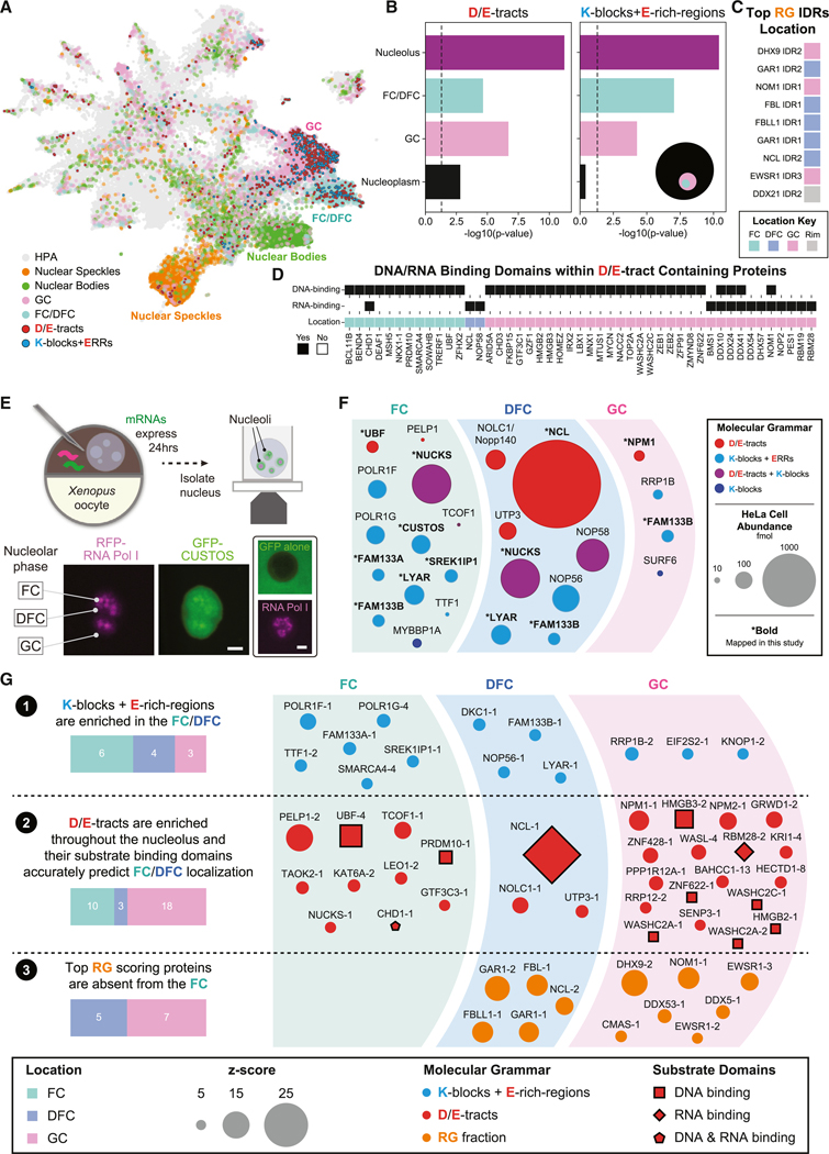 Figure 2. Proteins with K-block + E-rich regions preferentially localize to the FC, whereas the top RG-rich IDRs are depleted from the FC(A) UMAP representation of the Human Protein Atlas (HPA) with nuclear speckles, nuclear bodies, GC, and FC/DFC highlighted. Proteins containing the 140 distinct D/E tracts and 36 K-blocks + E-rich regions (ERRs) are shown in red and blue, respectively.(B) Fisher’s exact test of the frequencies of D/E tracts and K-blocks + E-rich-regions IDRs in the nucleolus, FC/DFC, GC, and nucleoplasm compared with the remaining human IDRome. The vertical line corresponds to a p value of 0.05.(C) Localization (from HPA) of the top nine scoring RG-rich IDRs in the nucleolus.(D) Examination of all DNA- or RNA-binding proteins that also contain D/E tract IDRs within the FC/DFC/GC. Both location and whether the protein contains a DNA- or RNA-binding domain are shown.(E) Schematic of method for obtaining live GVs from Xenopus oocytes and imaging nucleoli therein (see STAR Methods for details). Representative image of a nucleolus co-expressing GFP-tagged CUSTOS/c12orf43 or GFP with RFP-tagged PolR1E (subunit of RNA polymerase I with known preferential FC localization).(F) Spatial map of proteins with high-scoring K-blocks + E-rich regions and D/E tracts IDRs in the FC/DFC/GC phases of the nucleolus.(G) Summary schematic showing localization of K-blocks + E-rich regions, D/E tracts, and RG-rich IDRs with Z score ≥ 5.5.See also Figure S2. |