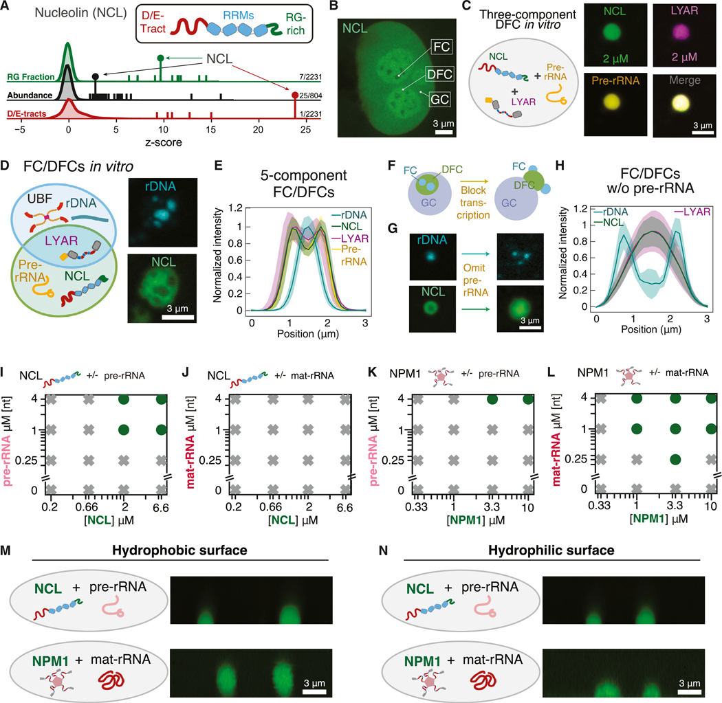 Figure 4. Substrate-specific condensation and hydrophobicity/hydrophilicity of condensates contribute to organization of nucleolar sub-phases(A) Schematic of NCL and density distribution graphs showing the relative rank of NCL for fraction of sequence that contains an RG block among all nucleolar IDRs (7th out of 2,231), abundance among all nucleolar proteins (25th out of 804), and D/E tract (neg-neg patterning) among all nucleolar IDRs (1st out of 2,231). The tall/capped marker indicates NCL; vertical stripes indicate all proteins ranking above NCL and the five closest proteins ranking below it.(B) Representative images of nucleoli from a living Xenopus laevis oocyte expressing GFP-tagged NCL. This highlights the exclusion of NCL from FCs and localization to the DFC and GC.(C) Schematic and images of three-component mixtures of NCL, LYAR, and pre-rRNA as minimal in vitro reconstitutions of the DFC.(D) Schematic of the quinary mixture and images of multiphase condensates reconstituted in vitro. UBF always colocalizes with rDNA (see Figure 3G).(E) Line scan analysis of condensates formed by the quinary mixture shown in (C). Solid curves correspond to median values, and shaded envelopes correspond to the 95% confidence intervals.(F) Schematic of nucleolar re-organization resulting from transcription inhibition.(G) Images of rDNA and NCL in condensates formed by quinary mixture and a ternary mixture where pre-rRNA is omitted.(H) Line scan analysis of condensates in the ternary mixture. Curves and shadings are similar to panel (E).(I–L) Two-component phase diagrams of NCL or NPM1 with either pre-rRNA or mat-rRNA.(M–N) Sagittal slices of three-dimensional (3D) confocal images of condensates formed by mixtures of NCL and pre-rRNA (top row) or NPM1 and mat-rRNA (bottom row) resting on coverslips with (M) hydrophobic or (N) hydrophilic surface treatments. For all quantifications, n = 25 condensates. Scale bars for all images, 3 μm. Concentrations of UBF, NCL, and NPM1 were set at endogenous levels. The concentration of LYAR was 2 μM in mixtures shown in (C) and (D) and endogenous levels for those shown in (G);See STAR Methods for additional details.See also Figure S4. |
