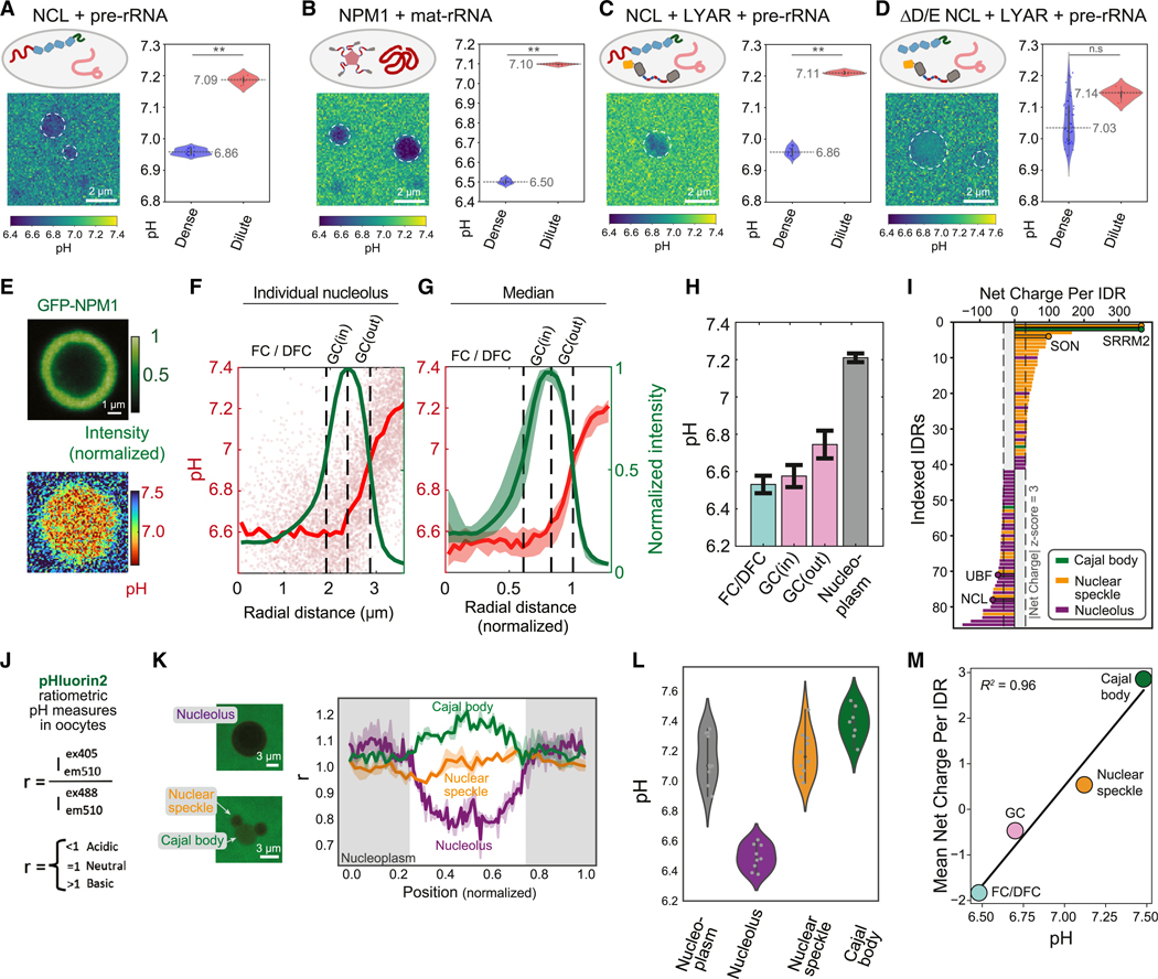 Figure 7. Distinctive compositional biases give rise to acidic nucleoli and non-acidic nuclear speckles and Cajal bodies(A–D) Images of in vitro condensates and violin plots of measured pH values for dense phase condensates and surrounding dilute phase for the following mixtures: (A) NCL (5 μM) and pre-rRNA (1 μM [nt]), (B) NPM1 (5 μM) and mat-rRNA (2 μM [nt]), (C) wild-type (WT) NCL (15 μM), LYAR (0.2 μM), and pre-rRNA (1 μM [nt]), and (D) ΔD/E NCL (15 μM), LYAR (0.2 μM), and pre-rRNA (1 μM [nt]). Images show the measured pH on a per-pixel basis. Median pH values are indicated in violin plots; n.s. (not significant) denotes p values > 5.00e–02, ** denotes p value < 1.00e–03.(E) Confocal images of a nucleolus in a living Xenopus oocyte GV expressing GFP-NPM1 (shown in upper panel) with freely diffusing SNARF-4 dye, whose ratiometric fluorescence is used quantify pH on a per-pixel basis (shown in lower panel); scale bars, 1 μm.(F and G) Values of pH and normalized GFP-NPM1 intensity plotted against radial distance from the center of a nucleolus for the individual nucleolus (F) and median values (G) (x axis = actual distance [μm]) from five separate nucleoli (x axis = normalized distance). Solid curves correspond to median values, and dashed vertical lines demarcate boundaries of the GC (full-width half max of GFP-NCL signal) and its peak-intensity point. Points in the individual nucleolus plot (F) correspond to quantified pH values for individual pixels, and shaded regions in the median plot (G) correspond to the 95th percentile confidence interval of all values.(H) Bar plot of median pH values across five nucleoli binned by FC/DFC, GC (inner half), GC (outer half), and nucleoplasm; error bars are standard deviation of measurements.(I) Sorted net charge per IDR for all IDRs in the nucleolus, nuclear speckles, and Cajal body with a |net charge| Z score of ≥3 when compared with the human IDRome.(J) The pHluorin2 r value is obtained by dividing the two emission intensities (each at 510 nm) from the same pHluorin2-containing sample excited (sequentially) by a 405 nm laser and a 488 nm laser; relationship of r to pH is indicated.(K) Representative images and line scan profiles of pHluorin2 r values for nucleoli, nuclear speckles, and Cajal bodies in living Xenopus oocyte GVs expressing freely diffusing pHluorin2. Line scans through nuclear bodies are represented as normalized distance; solid curves and surrounding shaded region correspond to median values and 95th percentile confidence intervals, respectively (n ≥ 7 for each nuclear body). Gray shaded region corresponds to nucleoplasm.(L) Violin plots of computed pH based on pHluorin2 r values for each nuclear body and nucleoplasm.(M) Plot of mean net charge per IDR against measured pH for each nuclear body (R2 = 0.96 for linear regression).See also Figure S7. |