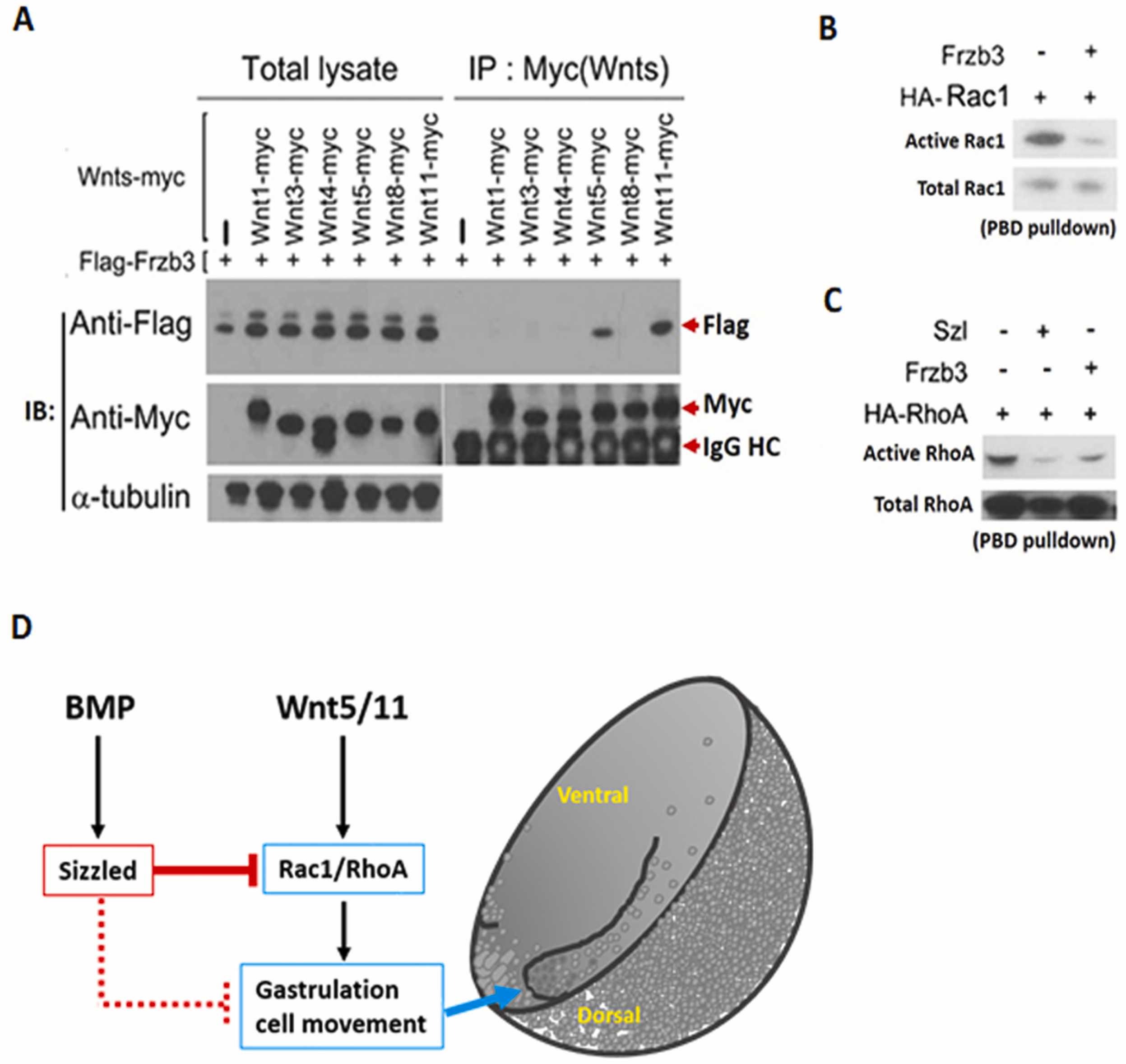 Sizzled (frzb3) physically interacts with non-canonical Wnt ligands to inhibit gastrulation cell movement.