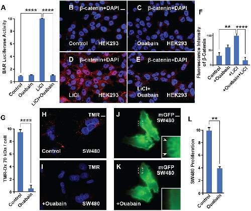 Fig. 3.Ouabain inhibits β-catenin signaling, macropinocytosis, and cell proliferation. (A) β-catenin transcriptional activity stimulated by Wnt3a was strongly inhibited by Ouabain in HEK293BR cells. (B) Untreated HEK293BR (BAR/Renilla) cells stained with total β-catenin antibody. (C) HEK293BR (BAR/Renilla) cells treated with Ouabain showed no changes in β-catenin levels. (D) LiCl (40 mM) activates the β-catenin transcriptional response as shown in the BAR-luciferase assay. This effect was blocked with Ouabain (1 µM) treatment. (E) The increase of β-catenin levels due to LiCl, which increases macropinocytosis (Albrecht et al., 2020), was blocked by Ouabain. (F) Quantification of the β-catenin levels from B and E. (G) Quantification of the macropinocytosis uptake of TMR-dextran 70 kDa into SW480 cells and its reduction by Ouabain treatment. (H) TMR-dextran 1 (1 mg/ml) uptake into SW480 cells after 1 h of incubation. (I) TMR-dextran uptake after 1 h of incubation is reduced with Ouabain (200 nM) treatment. (J-K) SW480 cells transfected with membrane-GFP display sustained macropinocytic vesicles (arrowhead and inset) that were rapidly blocked within 30 min of Ouabain treatment (still images from Movie 1). (L) Cell proliferation in SW480 cells is decreased by Ouabain treatment (200 nM), only viable cells were scored. All experiments with cultured cells were biological triplicates. Error bars denote SEM (n≥3) (**P<0.01, ****P<0.0001). Scale bar: 10 μm. |