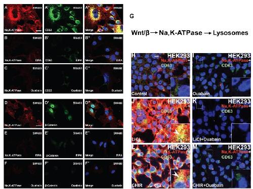 Fig. 6.Model of Ouabain blocking the Na,K-ATPase pump and macropinocytosis, resulting in inhibition of Wnt signaling. The Na,K-ATPase transmembrane protein is a member of the P-type ATPase family that pumps three Na+ ions out of cells while pumping two K+ ions into cells, establishing the electrical potential across membranes. The cardiotonic steroid Ouabain is a selective Na,K-ATPase inhibitor targeting the α1-subunit that blocks macropinocytosis, lysosomes, and Wnt signaling. |